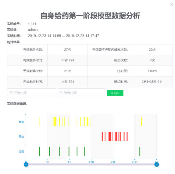 軟件分析的數據有:實驗時間,有效觸發次數,無效觸發次數,給藥次數(投食次數),有效觸發時間,無效觸發時間,斷點時間,不應期內觸發次數等